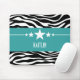 Trendy and modern Sassy Star Zebra Mousepad featuring a chic black and white zebra print background and a bold turquoise border adorned with a fun star motif. This girly design may be customized with the personalized text of your choosing. Click "Customize It" to find more personalization options.