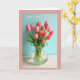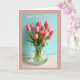 This greeting card features a still-life bouquet of coral‑pink flowers that lean toward each other like close friends, their petals shifting from deeper color at the edges to a soft blush near the center ❤️. The blooms sit in a clear glass vase with a gently fluted rim that catches the light in small highlights. Inside the vase, transparent water reveals bright green stems crossing and weaving together, adding a fresh, lively contrast. The scene is lit with soft, diffused light that gives everything a calm, cozy glow. A muted teal background sets off the pink flowers, creating a gentle, romantic contrast without feeling loud. Near the top, a short message appears in white flowing lettering, centered above the bouquet and easy to read 🌼. A thin rose-colored border frames the design, and the vase rests on a pale surface with a faint reflection beneath it.