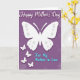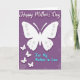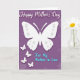Designed with a deep royal purple background, this card centers on a large white butterfly whose wide wings show fine, curling decorative lines that feel gentle and affectionate ❤️. Soft, hazy floral and swirl shapes sit in the background like a quiet garden evening, adding depth without stealing attention. In the lower-left corner, four smaller white butterflies rise upward in a loose cluster, like close companions drifting together in a tender, friendly glide. Across the top, the words “Happy Mother’s Day” appear in white flowing lettering that arches slightly to follow the curve of the design. On the lower right, “For My Mother-in-Law” is set in a bright teal, standing out clearly against the purple and balancing the white elements 🌼. A subtle shadow under the butterflies and the white text gives them a lightly lifted, hovering look. The central butterfly’s wings remain the brightest point, framed by the faint background motifs and the ascending group near the bottom-left. The teal line of text sits just above the lower edge on the right, with the four small butterflies clustered opposite it on the left.