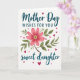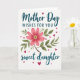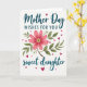 Designed with a white background, this digital illustration centers on a large many-petaled flower in rosy pink and deep crimson, painted with soft brush-like texture. A yellow-white cluster of stamens glows at the middle, while green leaves and slim brown stems curl around it like a gentle embrace that suggests closeness between loved ones ❤️. Deep teal text sits above and below the flower, with “Mother Day” near the top and “sweet daughter” near the bottom in flowing lettering. Between those lines, “WISHES FOR YOU” appears in uppercase, also in deep teal, set in a simple sans-serif style for contrast. Small hearts in fuchsia and rich magenta are sprinkled around the flower, like affectionate notes drifting across the page 🌼. The layout keeps the flower as the focal point, with the words framing it rather than covering it. Several tiny hearts float along the upper left and right areas, with a few more scattered near the lower corners.