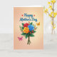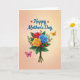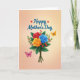 Designed with a lush floral bouquet as the focal point, this card features three fully opened roses in deep red, warm golden-orange, and calm blue, shaded with smooth gradients that make the petals look soft and touchable ❤️. Surrounding the blooms are rich green leaves and small sprigs dotted with shiny red berries, adding texture and a cozy, close-to-nature feel. The stems are gathered neatly with a twine-like tie, giving the arrangement a grounded, intimate look, like something carried home for someone special. Near the top, a short message sits above the flowers in flowing teal lettering, with tiny red heart icons sprinkled around the words. Two winged insects add gentle motion: an orange one hovers near the upper right of the bouquet, while a pinkish-purple one rests near the lower left, creating a balanced, affectionate scene 🌼. The lighting stays soft and diffused, keeping the colors rich without sharp shadows and letting the bouquet feel warmly inviting. Behind everything, the background fades from a creamy peach at the top into a deeper rosy tone toward the bottom.
