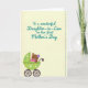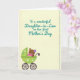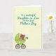 This card features a soft, creamy background that feels gentle and welcoming, with a flowing teal message placed across the upper area. Below the text, a small brown plush-like animal with a sweet, shy smile sits in a bright green baby carriage, giving the scene a tender, caring mood ❤️. A purple flower tucked behind its ear adds a friendly, affectionate touch, like it’s dressed up for someone special. The carriage is decorated with tiny white daisy-like flowers and scattered colorful dots, suggesting a light springtime setting. Cradled in the animal’s paws is a small pink package tied with a ribbon, like a quiet gift shared between close loved ones 🌼. Along the right edge, a slim vertical border shows repeating teal leaf shapes with little pink dots between them. The teal lettering stands out clearly at the top, while the green carriage and dark spoked wheels anchor the illustration near the bottom.