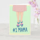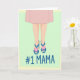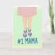 This greeting card shows the lower half of a standing figure in a soft pastel pink skirt, with slender legs and warm peach-toned skin that feels gently cared for. The focus drops to rich teal open-toed shoes, each topped with a small pink flower at the instep, like a sweet detail chosen with love ❤️. The smooth, flat colors and crisp outlines keep the scene simple and modern, letting the tender styling do the talking. A calm mint-green background sets a relaxed mood, edged by a thin pale-yellow border that frames the figure like a quiet spotlight. Centered below the legs, the text “#1 MAMA” sits in teal, in thick, friendly lettering that stands out clearly against the light background. The overall layout leaves open space around the figure, giving the design an airy feel and a gentle, close-to-the-heart tone 🌼. The skirt hem curves softly above the ankles, and the teal shoes angle slightly inward beneath the centered “#1 MAMA” text.