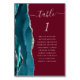The left-hand edge of this elegant modern wedding table number card features a teal blue watercolor agate border trimmed with faux silver glitter. The word "table" appears in silver gray handwriting script on a burgundy background. Add the names of your guests who are assigned to each table.