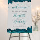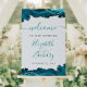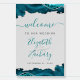 This elegant wedding welcome sign features top and bottom borders of watercolor agate geode in shades of teal with faux silver glitter highlights. The word "welcome" and couple's names appear in modern teal blue handwriting script on a pale gray background over a medium gray ampersand, with additional text in charcoal gray.
