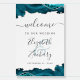 This elegant wedding welcome sign features top and bottom borders of watercolor agate geode in shades of teal with faux silver glitter highlights. The word "welcome" and couple's names appear in modern charcoal gray handwriting script on a white background over a pale teal ampersand, with additional text in charcoal gray copperplate font.
