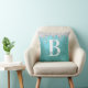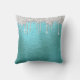 Teal turquoise throw pillow with brushed metallic background and silver glitter drip border personalized with a white monogram initial and handwritten script name in blue green. Ideal gift for the one who likes a little sparkle or decorating a room in a trendy fun style. Contact the designer via Zazzle Chat or makeitaboutyoustore@gmail.com if you’d like this design modified, on another product or would like coordinating items.