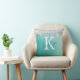 Teal turquoise aqua throw pillow with brushed metallic background and silver glitter drip border personalized with a white monogram initial and handwritten script name in teal. Ideal gift for the one who likes a little sparkle or decorating a room in a trendy cool style. Contact the designer via Zazzle Chat or makeitaboutyoustore@gmail.com if you’d like this design modified, on another product or would like coordinating items.