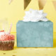 A snowstorm of teal colored snowflakes falling down on a darker teal textured wrapping paper.