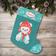 An adorable little white polar bear wears a red stocking cap and holds a teal and red wrapped gift package on the front of this cute kids' stocking. The image is placed on a teal background, and a teal and white snowflake pattern border at the top and at the toe. Your child's name is on a red lined white banner on the top snowflake pattern border. The back of the stocking is the same teal and white snowflake pattern. Cute!