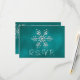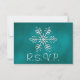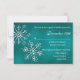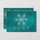 Beautiful snowflake wedding response cards with a two pretty snowflakes on a glowing teal green turquoise peacock blue background. Perfect for a winter wonderland or Christmas themed wedding. Artwork © Chrissy H. Studios, LLC. All rights reserved.