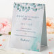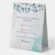 Teal COVID Safety Break Room Table Tent Sign with eucalyptus leaves and modern typography. "Please remember to stay a safe distance from coworkers and wash your hands before and after eating. Thank you!"