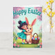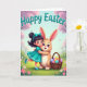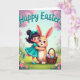 This card shows a young girl in a teal dress with a matching hair bow hugging a light-brown bunny 🐰, their faces close with a tender, friendly gaze. Her smile is wide and bright, and the bunny’s large purple eyes look soft and calm, making the embrace feel affectionate without needing words. They stand in a spring meadow with gentle green grass, scattered little flowers, and a few 🌷 near the foreground. Behind them, pink blossoms spread across leafy branches, and a pale blue sky keeps the scene airy and light. A woven basket sits beside the bunny, filled with colorful patterned eggs in pastel shades, adding a festive touch. The girl’s foot is slightly lifted as her arm curves around her companion, as if she just leaned in for a quick cuddle. Near the top, the words “Happy Easter” appear in teal lettering, centered above the characters against the sky. Pink blossoms frame the upper corners while the basket of eggs rests to the lower side of the bunny.