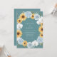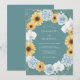 A striking teal backdrop provides the base for this botanical design, featuring a lush arrangement of golden sunflowers, pale blue hydrangeas, and elegant white orchids. The vibrant color palette creates a cheerful and sunny atmosphere perfect for a late summer or early autumn event. Delicate watercolor details bring the floral elements to life, offering a sophisticated and artistic aesthetic.