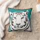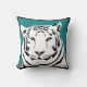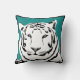 A gorgeous black and white tiger image on teal background with black trim highlighting the edge. The image is duplicated on both the back and front of the cushion.