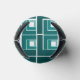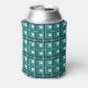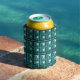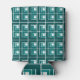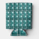 This can cooler has a geometric design made from Ls in shades of teal laid in different directions repeating across the design.