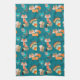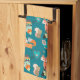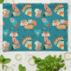 This attractive hand towel features a colorful pattern of cute fox images wearing boho style tribal attire. Along with the fox images are images of a tribal feather, leaf, and little brown squirrel. There is also a teal and pink heart arrow. The images are placed on a darker teal background.