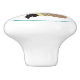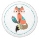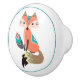 A colorful, cute fox wears boho style tribal attire and holds a pattern feather on this ceramic drawer knob. The image, in orange and turquoise, is placed on a white background, and ringed with a thin teal circle.