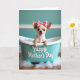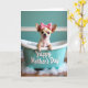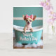 This card shows a tiny, light-furred puppy sitting snugly in a pastel teal mini bathtub, looking straight out with big dark eyes and perky ears. A pink bow with small dots sits near its head, adding a sweet touch that feels like a friendly wink ❤️. The puppy’s open-mouthed grin and little pink tongue give the scene a cozy, affectionate mood, like it’s sharing a happy moment with someone close. Soft light falls across a calm teal wall behind it, while a warm, polished wooden floor below makes the cool tub color stand out. White suds spill around the base of the tub, and a few clear, shiny round beads glimmer in the bathwater like tiny bubbles catching the light. Along the outside of the tub, a short greeting appears in white flowing lettering, centered and easy to notice, with the rest of the design kept simple around it 🌼. The teal tub has curved sides and sits slightly angled, with foam clustered near the front edge on the wooden floor.