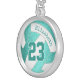 This colorful girly volleyball necklace features a simple volleyball graphic that has a floral kaleidoscopic pattern blended with the turquoise to teal gradient colored panels - her name and jersey number are customizable - by katz_d_zynes
