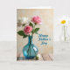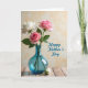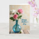 This card features a calm still-life scene centered on a rounded teal glass vase set on a warm, textured wooden surface. Three flowers rise from the vase—two soft blush-pink blooms and one creamy white bloom—tilting slightly toward each other in a way that suggests a tender closeness ❤️. Green stems and leaves add a fresh touch of color against the wood grain, like a quiet moment shared between loved ones. Gentle, diffused light gives the glass a soft shine and traces the layered petals with a cozy glow. The background fades into a smooth beige-and-cream blur, keeping the focus on the flowers and creating a peaceful sense of space. On the right side, the words “Happy Mother’s Day” appear in teal lettering that matches the vase, standing out clearly without overpowering the scene 🌼. In the foreground, a small white rosebud rests on the wooden planks near the base of the vase.
