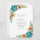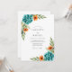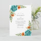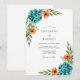 This botanical design features vibrant watercolor teal hydrangeas paired with bright orange poppies. Lush green foliage creates a natural, airy aesthetic perfect for a seasonal event. The color palette of deep aqua and warm terracotta offers a striking contrast. Ideal for couples seeking an elegant yet colorful floral theme.