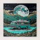 Cool ai art depicting a teal RV camper driving through the mountains with a full moon in the background.