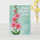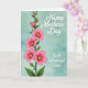 This design shows a tall floral stem rising along the left edge, with bright pink blossoms opening toward the right like they’re leaning in for a gentle hello ❤️. Deep green leaves and small buds tuck around the flowers, adding a quiet, growing energy that feels like close family affection shown through simple gestures. Each bloom has a yellow-green center that pops against the rich pink petals, drawing your eye the way a tender glance draws attention in a warm room. The background is a soft, mottled aquamarine wash with subtle teal variations, giving the scene a calm, airy setting that lets the flowers feel cherished and noticed. In the upper right, the words “Happy Mother’s Day” appear in crisp white lettering, spaced neatly so the message feels light and open. In the lower right, “To A Wonderful Sister” is also set in white, balanced under the first line so the two phrases feel connected like a shared bond 🌼. The overall layout keeps the florals on the left and the messages on the right, with plenty of breathing room between them. The petals show fine individual shapes and a smooth painted look, while the aquamarine background softly fades and speckles behind the white text.