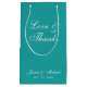 A simple weeding favor bag with a very modern color: teal blue. It has just white text on teal blue background. The message "Love & Thanks" and the names of the bride and groom are written in elegant calligraphy.