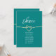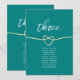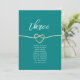 Modern, minimalist, elegant teal wedding table number - seating chart with gold rope heart and simple handwritten calligraphy script.
