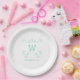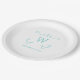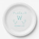 Modern and simple Whimsical Flourish Monogram Wedding Paper Plates featuring an elegant swirl motif in turquoise. Easy to customize, simply add your initial and wedding details in the text fields provided. Click "Customize It" to find more personalization options.
