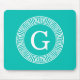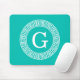 Teal White Greek Key Round Frame Initial Monogram Mouse Pad
