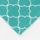 Fleece blanket in turquoise teal blue and white Moroccan quatrefoil lattice pattern.