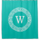 Teal Wht Greek Key Rnd Frame Initial Monogram Shower Curtain