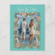Bright and cheerful, like your planned wedding! Add your favorite photo of the celebrating couple. Whimsical hand drawn watercolor artwork of two bluebirds on blossom-and-butterfly filled branches, with a draped white ribbon for a touch of festivity! The light teal background sets off the coral, green and white artwork beautifully; the back of the card is teal with customizable message templates. The text is dark gray and ocean blue. All text templates are designed to make it easy for you to add your information.