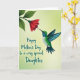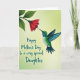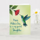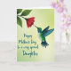 This design shows a tiny bird in mid-flight, its emerald-green feathers and teal wings framing a white belly as it leans toward a many-petaled crimson flower like a gentle kiss ❤️. The bird’s turquoise-blue throat catches the light, and its slim beak nearly touches the bloom, creating a tender, affectionate moment in the air. The flower and its leafy green stem extend in from the upper left, setting a diagonal line that guides your eye toward the bird. Behind them, a soft gradient shifts from bright lime green to mellow yellow-green, giving the whole scene a sunny, welcoming glow 🌼. Fine detailing in the feathers suggests a subtle shimmer, while the layered petals look carefully shaded for depth. A short message appears in the lower left in dark forest-green lettering, sitting low and slightly angled to balance the motion above. The red blossom is positioned near the upper center-right, with deep green leaves fanning outward against the light background.