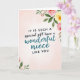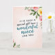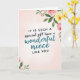 This card features a soft blush background that sets a gentle, affectionate tone, like a warm hug between close family or friends ❤️. The main wording sits across the center with a slight diagonal slant, creating a relaxed, flowing layout. The phrase “wonderful niece” appears in teal, while the surrounding words are in black with a mix of uppercase and flowing letterforms for contrast. The teal phrase is placed as the focal point, with the darker text supporting it above and below so your eye naturally follows the message. In the top right corner, a small bouquet of roses and leaves leans inward, as if it’s quietly framing the words. In the bottom left corner, a matching floral cluster balances the design with pink and yellow blooms, green leaves, and tiny red berries 🌼. The flowers have a soft, watercolor-like look with gentle edges and light shading. The top-right bouquet includes a pale pink rose beside a sunny yellow rose, with scattered red berry dots and layered green leaves.