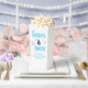 Team boy popcorn boxes for a gender reveal party. Modern design in blue with a stork delivering a baby. Personalize it with the soon-to-be parents' names and the date. A coordinating design in pink with team girl is available in the collection.