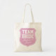 Team Bride tote bag personalized with name. Cute gift idea for bride, bridesmaids, maid of honor, mom, sister, friends etc. Pink emblem badge design for wedding party, bridal shower, bachelorette girls night out. Elegant script letters. Pink and white colors.