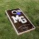A unique dark wood-themed monogram cornhole set specifically tailored to the freshly minted newlywed couple. It features a faux wood backdrop of dark mahogany wood. On top of this is. a bold monogram of the bride and groom in bold white font. Your wedding day details complete the lower half of the cornhole set. A fun way to make a statement on your wedding day, and as a fun home keepsake to pull out whenever company is over to play a fun game of cornhole!!