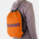 Drawstring bag with orange base and dark blue custom text design "Team Orange". It's now simple to personalize with your own team name, city logo, and so on.