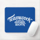 Teamwork makes the dream work blue and white mouse pad. Keep your team or yourself focused on the job with these motivational quote mouse pads. Reads teamwork makes the dream work. Background color can be changed to your own business color if required. Designed by Sarah Trett for www.mylittleeden.com