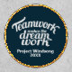 Celebrate a team project completion with this teamwork makes the dream work logo award patches. A typographical slogan patch in blue and white. Reads: Teamwork makes the dream work, and then you can customize it with your own project and date. Ideal to motivate staff, team-building exercises, or for sports teams to celebrate a milestone team achievement. Other matching items are avialable. Uniquely designed by Sarah Trett for www.mylittleeden.com
