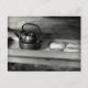 Black and white photo of a tray carrying a teapot and bowls, taken at a Japanese shrine.
