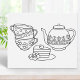 A stack of ornate teacups next to a lovely decorated teapot. A piece of cake on a plate completes this tea set. Made for easy coloring.