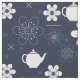 Blue and white pattern with flowers and teapots.