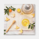 Glass teapot and teacup with green tea, honey, honey spoon, kumquats and cookies with butterfly shape over teatowel ready for teatime.