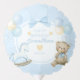 A birthday image with a blue background, featuring a bear with a blue bow around its neck, a white rocking horse with blue dots, and blue and beige balloons