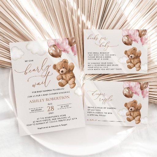 Add a personal touch to your baby shower celebration with these stylish and memorable party items! Design features teddy bear with pink balloons on beige background.