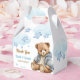 Teddy bear baby shower bearly wait cute teddy bear with balloons thank you favor gift boxes, teddy in a jacket and pants with bunch of balloons and clouds blue and brown muted colors.